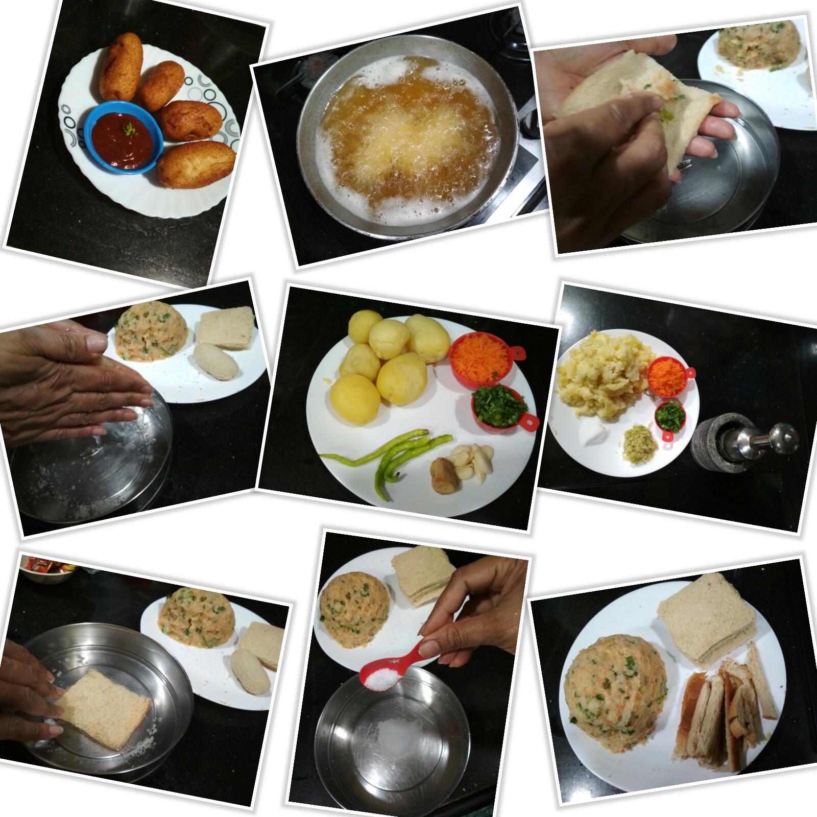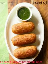 In the meantime, prepare the bowl of water with little salt dissolved in it. Dip the bread slice in water and remove the excess water by pressing the slice between two palms. Now place 1-2 tbsp of stuffing in the center of the bread slice, roll it and seal from all three sides. Prepare all the rolls and keep ready. When the oil is hot, put the bread rolls one by one in the pan. Fry till they become light golden brown.